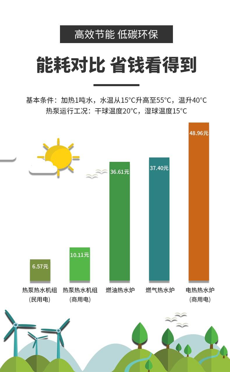 空氣源熱泵熱水機(jī)是目前世界上比較先進(jìn)的、能效比高的制熱設(shè)備之一,它根據(jù)逆卡諾循環(huán)原理,采用電能驅(qū)動(dòng),通過傳熱工質(zhì)把空氣中無法被利用的低品位熱能有效吸收,并將吸收回來的熱能提升至可用的高品位熱能并釋放到水中。在不同的工況下,空氣能熱水器每消耗1kW電能就能從低溫?zé)嵩粗形?~6kW的免費(fèi)熱量,節(jié)能效果非常顯著。