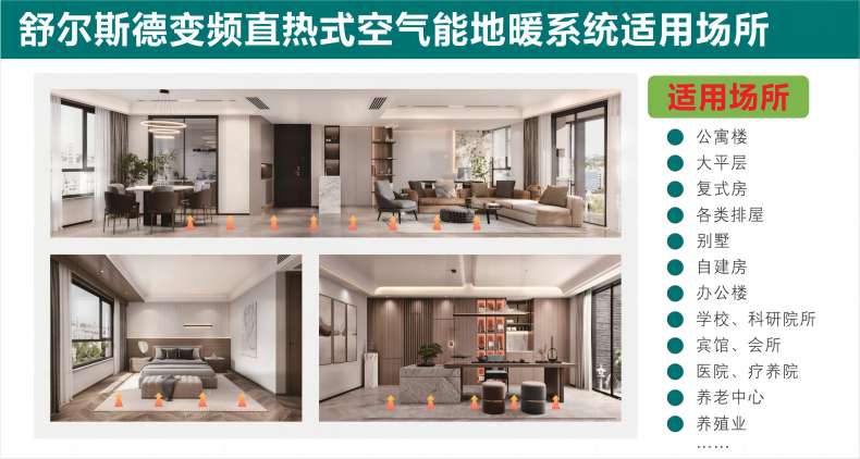 系統(tǒng)在環(huán)境溫度-35℃~43℃之間能正常工作,廣泛應用于住宅( 公寓樓/別墅排屋/自建房等 )、小區(qū)配套、辦公室、醫(yī)院、療養(yǎng)院、浴室、高端賓館等場所的冬季采暖。